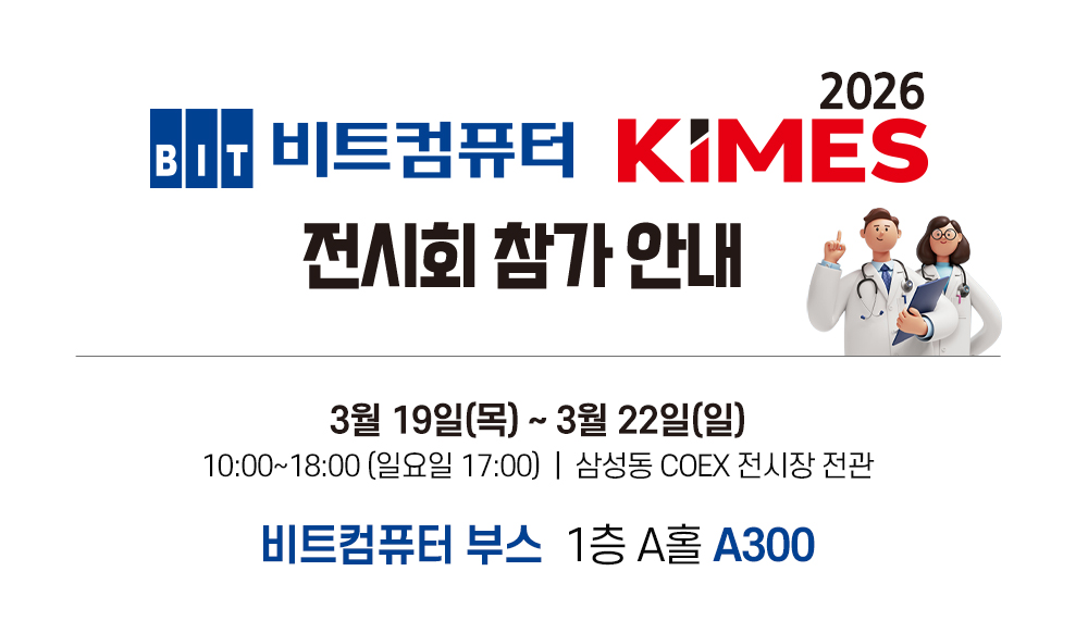 KIMES 2026제 41회 국제의료기기병원설비전시회 비트컴퓨터 참가 안내 3월 19일(목) ~ 3월 22일(일) 4일간삼성동 COEX전시장10:00~18:00 (일요일 17:00)비트컴퓨터 부스 1층 A홀 A300